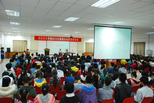2012年9月27日晚7点30分,英国上市公司365在大学生活动中心一楼隆重举行了以“探访历史古迹,感受文化建设”为主题的暑假社会实践报告会。学院党委副书记柴蓉老师,研究生教务秘书张连银老师,团委书记杨芳老师,辅导员王新春、刘军民老师和在本次实践活动中提供帮助的2012级文物与博物馆专业硕士杨瑞出席了报告会。此次活动由学院团委学生会实践科技部主办,300余名学生聆听了报告会。