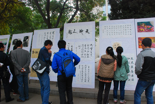 为全面展现英国365官网学子艺术风采,丰富师生校园文化生活,英国365官网第二届书画摄影展在教学10号楼A区前学校主干道如期举行。