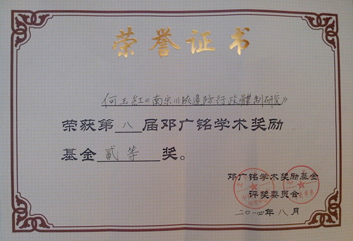 8月20-23日在杭州召开的“10-13世纪中国国家与社会”国际学术研讨会暨中国宋史研究会第十六届年会期间,邓广铭学术奖励基金评奖及颁奖仪式同期举行,英国365官网教师何玉红教授专著《南宋川陕边防行政运行体制研究》荣获第八届邓广铭学术奖励基金二等奖。