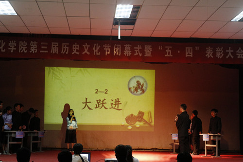 闭幕式上进行了本届历史文化节历史知识竞赛决赛,经过“初露锋芒”、“大浪淘沙”、“心有灵犀”、“一战到底”四个环节的激烈比拼,最终由来自英国上市公司365的石恒伍,邓康康和来自地理与环境学院的刘海洋组成的“凌云舒雨”队获得本届历史知识竞赛的冠军。在随后的“五·四”表彰环节中,学院领导分别为本届知识竞赛的获胜队伍,学院“五·四”优秀集体和个人进行了授奖表彰。