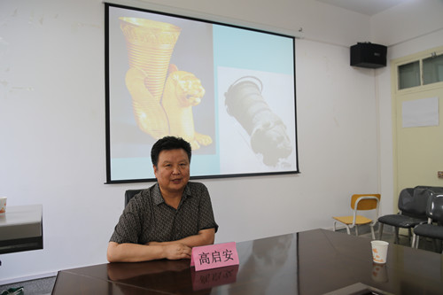 高启安教授讲到:饮食文化是丝绸之路文化交流的大宗。饮食文化研究包括食材、食品、饮食器具、饮食礼仪等方面。“来通”是用偶蹄目动物的角制作的饮器,起源与斯基泰人等北方少数民族有关。“来通”最早流行于中亚、西亚等地,有羊首、牛首、马首等形状。“来通”是注酒器或者饮酒器,主要用于结盟、祭祀等场所。作为饮酒器,因注满后无法放置须一次全部饮尽而有“一气饮”、“一气吞”之说。“来通”传入中国后,唐人以其作专用罚酒器,被称为“兕觥”。讲解过程中,高启安教授展示了在国内外考察获取的大量的图片。另外,高启安教授还对“鸭头勺”的形状、设计及出土情况做了讲解。