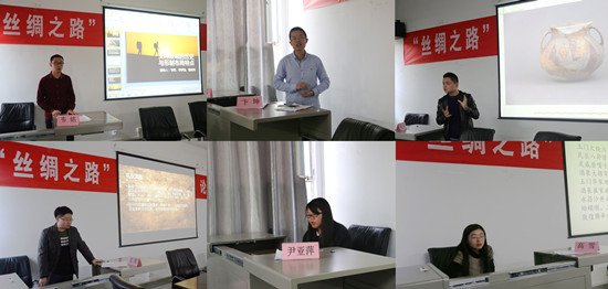 汇报中,韦铭同学结合自己在吐鲁番学研究院实习情况,介绍了交河故城的历史沿革、发展状况及各个功能区的布局和性质,并对城内建筑中“减地留墙”的营建方式作了详细的介绍。卞坤同学主要介绍了交河故城墓葬分布、形制及出土文物等情况,着重分析了沟北墓地出土的一件“鸟兽啄虎纹金牌饰”文化因素,并对交河故城在车师国时期与其他文化的交流融合作了探讨。甘肃省文物考古研究所实习的四位学生代表结合所从事的可移动文物普查工作,通过近距离观察不同地区不同时期的文物,提出了实习总结:王笑同学介绍了马家塬战国墓出土的车马和金属器物,展现了当时车马器的不同类型及功用;蒲阳同学介绍了甘肃东乡林家的石器及火烧沟的陶器,并对石器的标准化问题及史前刻画符号提出了自己的见解;尹亚平同学对汉代以来的铜镜进行了梳理。高雪同学介绍了部分典型遗址、墓地及出土遗物情况,如武威磨嘴子汉墓的仪礼简,玉门毕家滩的衣物疏等。