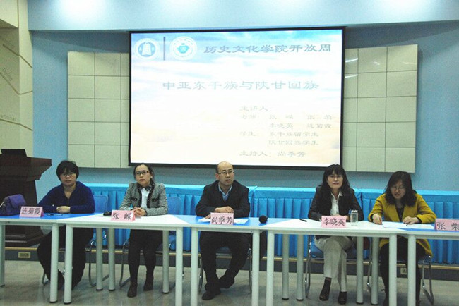 “中亚东干族与陕甘回族”讲座由中国现代史研究中心组织,尚季芳老师主持,张嵘、张荣、李晓英和连菊霞老师主讲,东干族留学生代表和陕甘回族学生代表参加座谈。本次讲座,老师与同学们以轻松快乐的方式讨论了东干族、回族风俗习惯等。