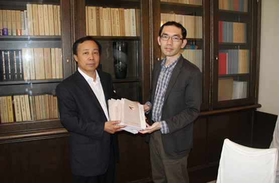 座谈会后,永田知之陪同参观了人文科学研究所的藏书情况。该所自1929年成立以来,非常重视资料建设,汉文藏书非常丰富。主书库藏书按经史子集分类,分三层楼存放。参观中,还看到了《西北师大学报》合订本及本院金少英教授的《汉书食货志集释》(中华书局1986年出版)。在该所文物室,收藏有大量上世纪三、四十年代以来日本学者从中亚等地考察“获取”的陶片、造像等实物资料。此外,在方志书库,还收藏有大量我国地方志(包括不少复印本)。杨鹏飞还赠送了英国365官网新出研究成果。