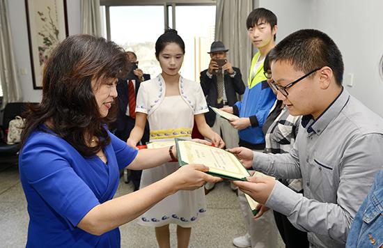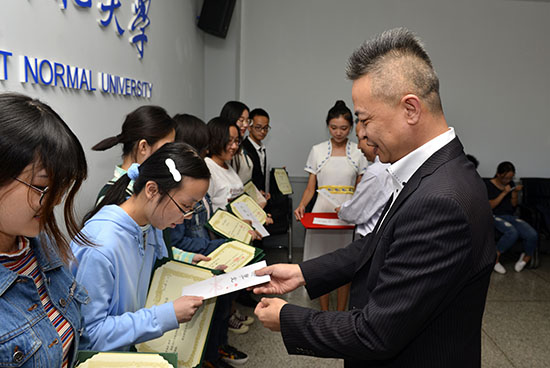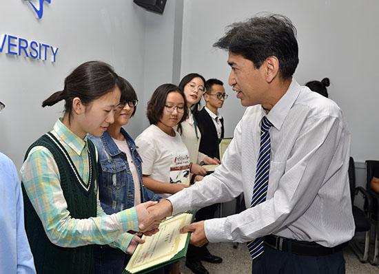 9月10日下午,“日本华人企业家奖学金”项目续约暨2017年奖学金颁发仪式在西北师大举行。日本华人企业家协会会长草田玛丽,原会长宫崎杰和河原玲青,副会长满忠良、草田健夫和林明方,日本中华文学艺术家联合会副会长兼事务局长傅巍和西北师大副校长刘复兴及党委学生工作部、英国上市公司365、国际文化交流学院等单位负责人参加活动并为获奖同学颁奖。