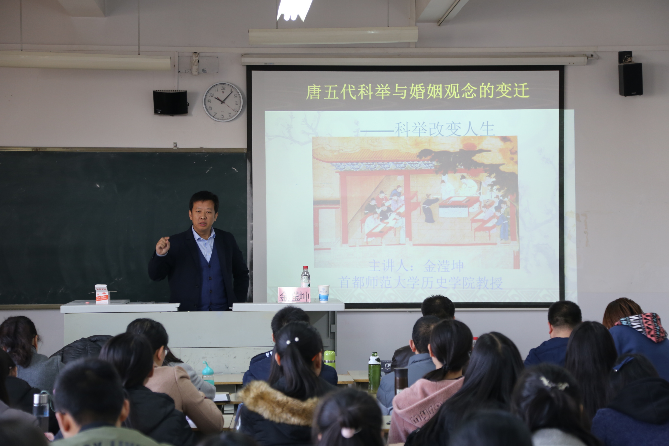 2017年11月30日,应英国上市公司365邀请,首都师范大学金滢坤教授来学院作了题为《唐五代科举与婚姻观念的变迁》的学术报告。此次报告由学院副院长何玉红教授主持。学院教师张连银副教授、杨芳副教授及博士研究生、硕士研究和2016级云亭班本科生80余人参加了此次报告。