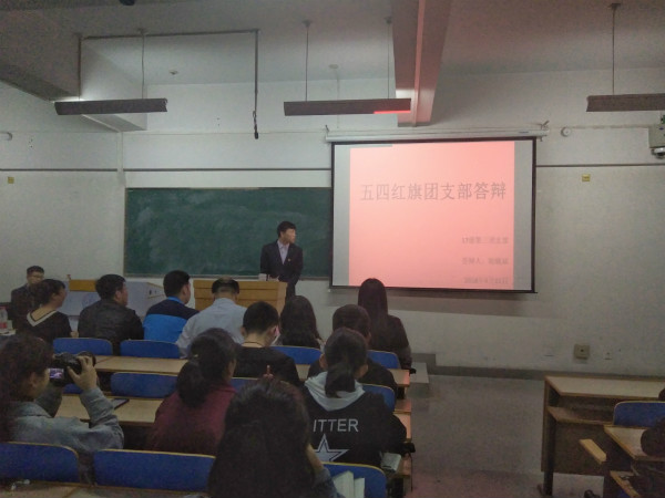 答辩会主要进行的有“五四红旗团支部”、“优秀共青团干部”、“优秀共青团网络宣传员”等的评选答辩。参评的各个团支部逐一进行了展示汇报,内容主要涉及团支部思想建设、组织建设、主题团日活动、团员参与学校各类活动情况、班级学风建设、文化建设、团支部及成员获奖情况、团支部微博建设情况等方面。参评的优秀共青团干部分别从学习、第二课堂拓展活动参与情况、获奖经历及其对身边团支部成员的引领作用等方面进行个人展示。参评同学充满激情地向同学们展示了一年来的活动成果和荣誉,一张张PPT正是各班在过去一年所做努力的最好见证,现场气氛热烈,掌声阵阵。参评同学展示完毕后,评委针对参评同学的展示及其申报材料进行现场提问。
