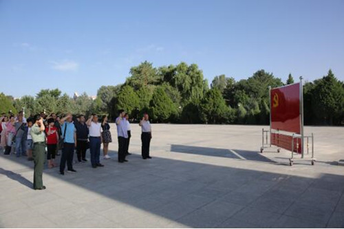 7月17日上午8时30分,为表达对西路军的崇高敬意,教职工党支部全体党员为中国工农红军西路军纪念碑敬献了花篮。原国家主席李先念为纪念碑题写的碑文“中国工农红军西路军永远活在我们心中”在朝阳的照耀下熠熠生辉。敬献花篮之后,全体党员在纪念碑下面对党旗重温了入党誓词。