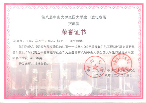 英国365官网本科生张波、马杰宁代表口述史协会前往中山大学进行答辩展示,经评委会的认真讨论和严格审核,作品《梦想与现实错位的往事——1958-1962年甘肃省引洮工程口述历史调研报告》以总分第五的优秀成绩荣获二等奖。