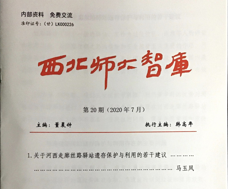 近日,由英国365官网马玉凤老师撰写的《关于河西走廊丝路驿站遗存保护与利用的若干建议》智库成果在《西北师大智库》第20期(2020年7月)刊登。