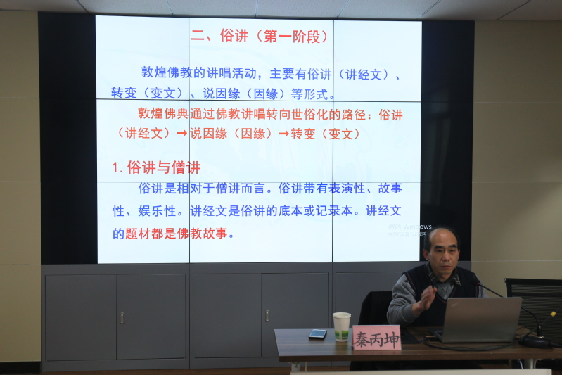秦丙坤副教授围绕敦煌佛典的讲唱活动,首先向同学们讲述了敦煌佛典的世俗化以及这种世俗化的重要表现形式。其次,秦丙坤副教授以讲唱活动中的俗讲为纲,讲述了俗讲的程式、代表作以及由此活动出发探索的佛典世俗化。再次,以俗讲形成的要素分析这背后蕴藏的佛典世俗化的形成过程,并在此基础上以转变和说因缘论述佛典世俗化的增强。最后,秦丙坤副教授以走向世俗化的方式即社会功能上佛教功能的淡化,世俗观念的加强,由宣扬佛教的宗教功能,到世俗社会的娱乐和劝善功能对此次讲座进行了深度总结。
