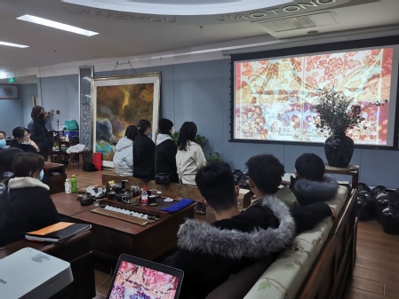丝绸之路染缬艺术博物馆集中展示了兰州交通大学管兰生教授团队和学生创作的百余幅染缬艺术作品,继承并发扬了丝绸之路染缬文化和敦煌艺术精髓。参观团观看了博物馆的镇馆之宝——由学生集体创作屡获殊荣的60米飞天长卷,以及由管兰生教授创作的《孔雀河》《积聚与裂变》等作品,这些都是不可多得的染缬艺术佳作。