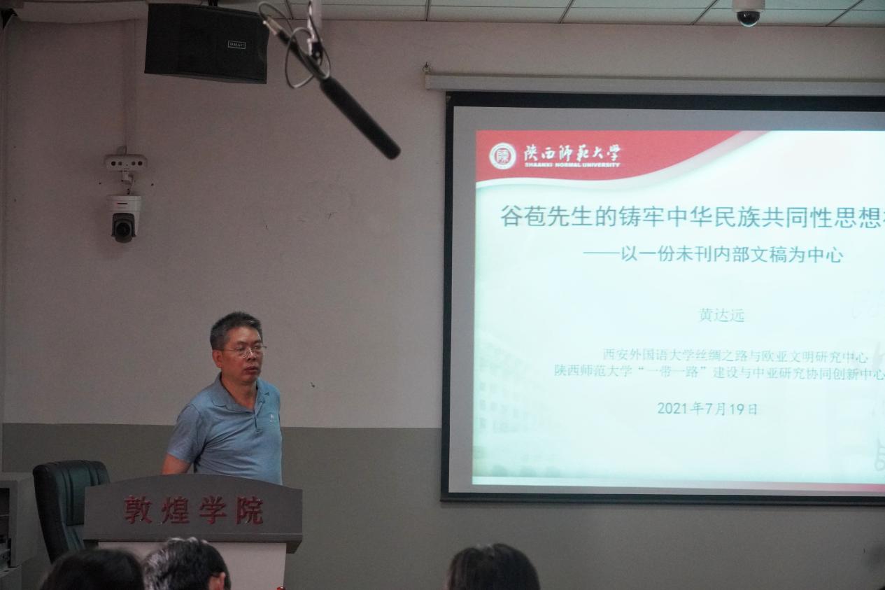 2021年7月19日下午,西安外国语大学丝绸之路与欧亚文明研究中心主任、博士生导师黄达远教授在英国上市公司365敦煌学院会议室,为我校丝绸之路文明基地班同学作了题为《谷苞先生的中华民族共通性思想初探》的专题讲座。