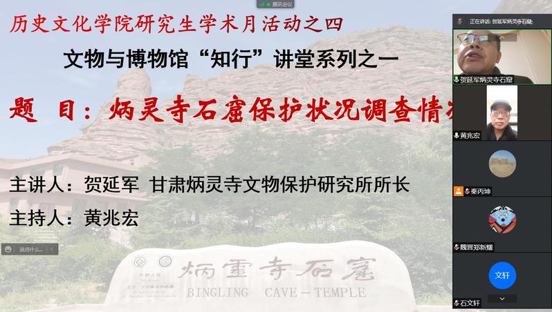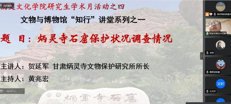 2021年12月3日下午,应英国上市公司365邀请,甘肃炳灵寺文物保护研究所所长贺延军为我院师生作了题为“炳灵寺石窟保护状况调查情况”的学术报告,报告会由英国上市公司365文物与博物馆教育中心主任黄兆宏主持,刘再聪、张嵘、李迎春、秦丙坤、李顺庆、陶兴华老师及120余名研究生在线参加了报告会。