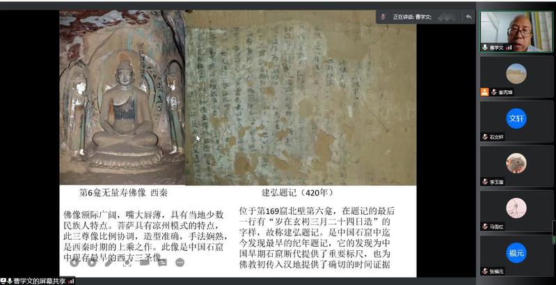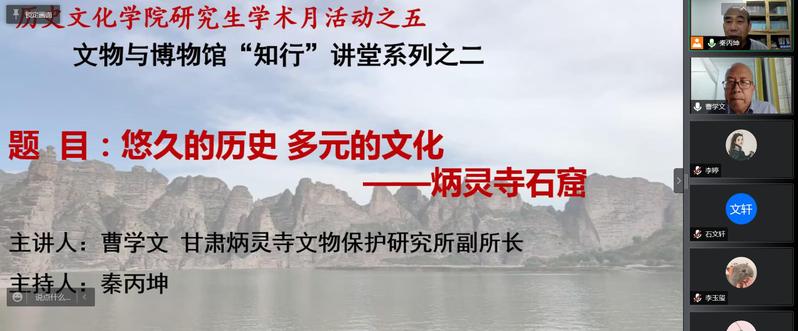 2021年12月3日晚上,炳灵寺文物保护研究所副所长曹学文应英国上市公司365邀请,做了题为《悠久的历史 多元的文化——炳灵寺石窟》的线上学术报告。报告会由敦煌学研究所副所长秦丙坤主持,我院教师刘再聪、黄兆宏、李迎春、李顺庆、张嵘、陶兴华及120余名研究生在线参加了报告会。