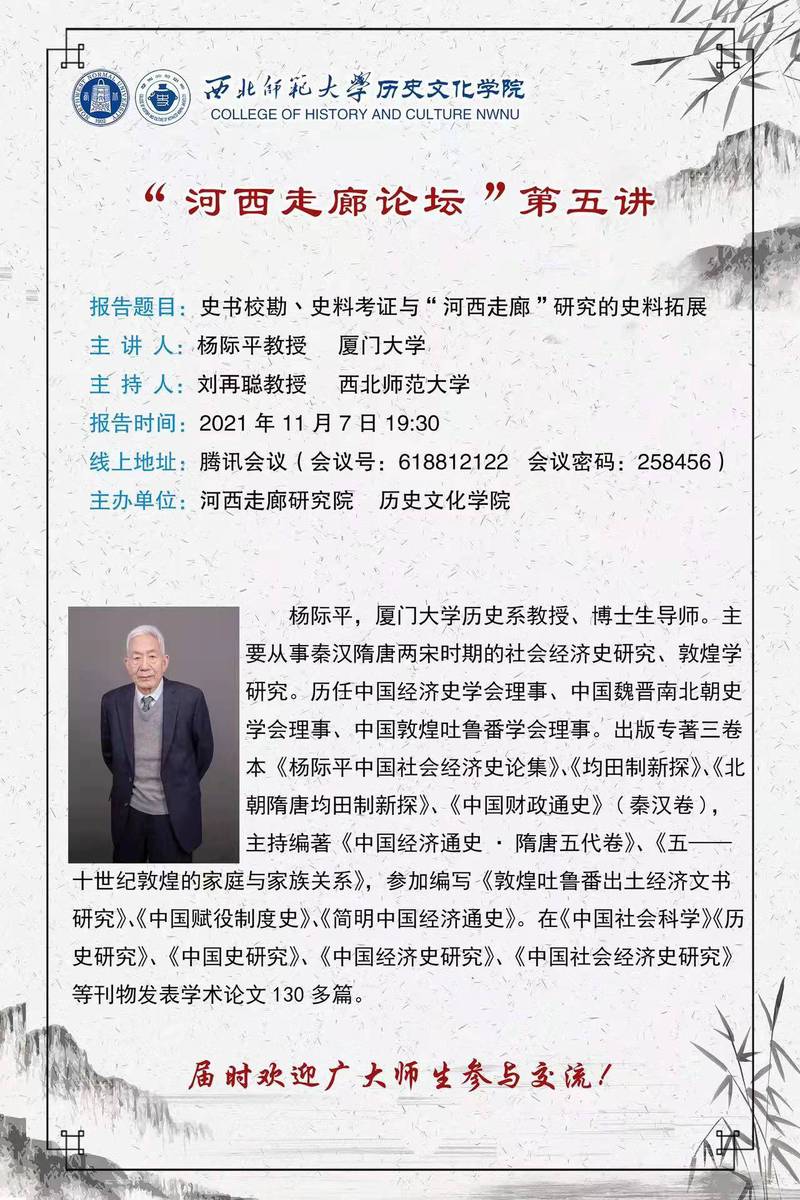 2021年11月7日,应英国上市公司365河西走廊研究院、英国上市公司365邀请,厦门大学历史研究所杨际平教授做了题为《史书校勘、史料考证与“河西走廊”研究的史料拓展》线上学术报告。报告会由英国上市公司365副院长刘再聪教授主持,英国上市公司365师生,以及来自国内其他高校与科研单位的师生、学者参加了讲座。