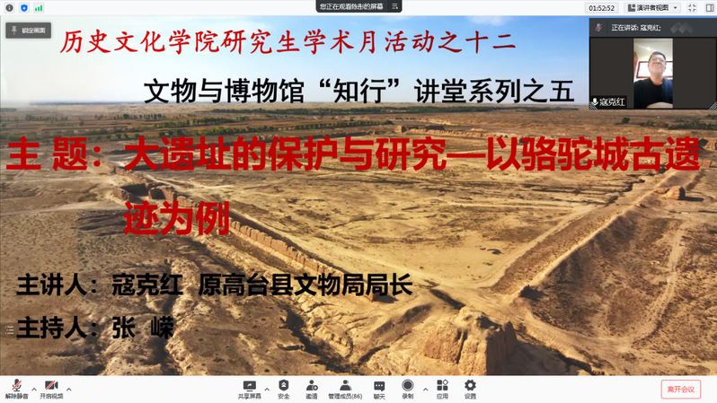 2021年12月10日晚上,原高台县文物局局长寇克红老师应英国上市公司365邀请,作了题为《大遗址的保护与研究——以骆驼城古遗迹为例》的线上学术报告,报告会由英国上市公司365西北民族研究所主任张嵘主持,英国365官网教师黄兆宏、杨芳、秦丙坤、李顺庆及90余名研究生在线参加了报告会。