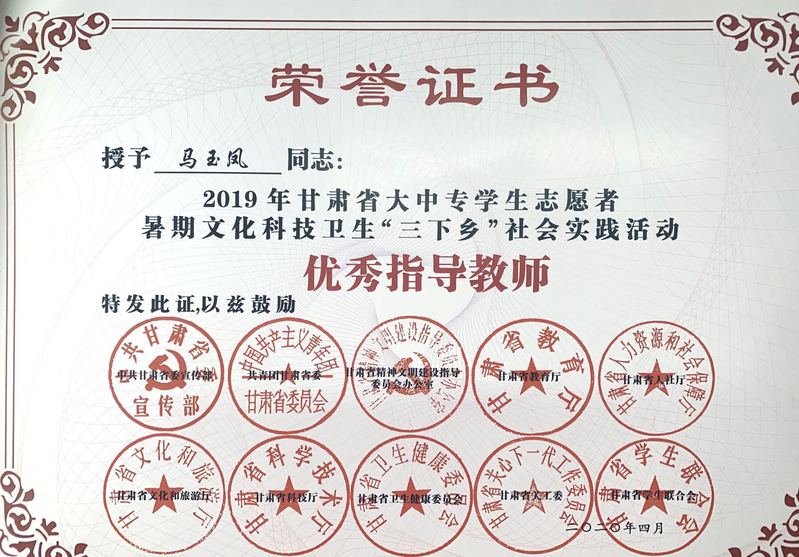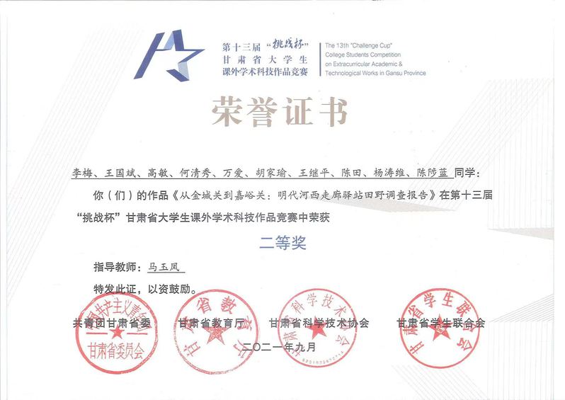 近日,英国365官网马玉凤副教授指导的《从金城关到嘉峪关:明代河西走廊驿站田野调查报告》在第十三届“挑战杯”甘肃省大学生课外学术科技竞赛决赛中获二等奖。马玉凤荣获“优秀指导教师”荣誉称号。