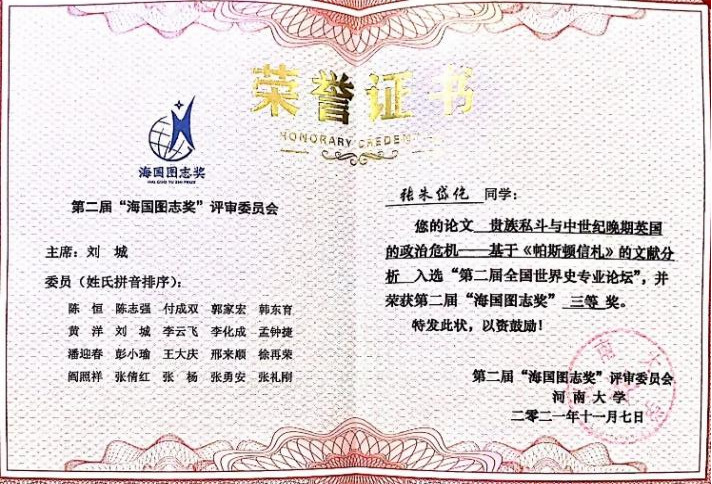 全国世界史专业论坛暨“海国图志奖”评选活动是在全国52家高校历史学院系的共同倡议下,为进一步推动培养世界史专业创新人才、助力新文科背景下世界史一流专业建设而创办的,首届于2019年在首都师范大学举行。第二届论坛由河南大学英国上市公司365主办及承办,首都师范大学历史学院协办。本届论坛共收到全国各高校260余名学生的参会申请论文,经论坛组委会筛选,共有60名同学的论文入围本次论坛。受疫情影响,本次论坛以在线会议的形式召开,共有近300名师生参会。经过严格的匿名评审,最终评选出一等奖4名,二等奖6名,三等奖10名。