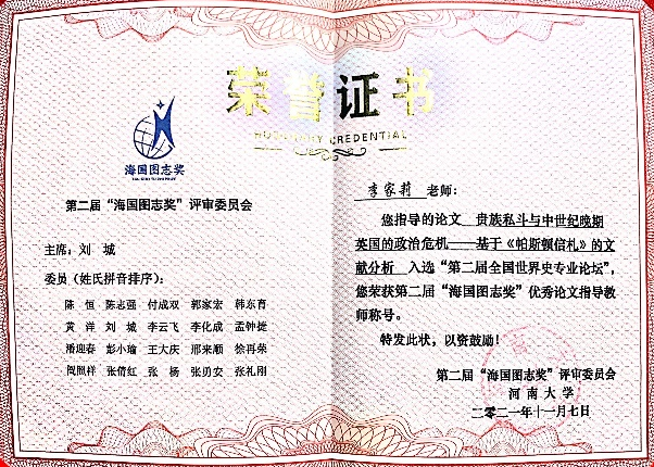 近日,英国365官网李家莉老师指导的2018级本科生王秋尧《伦敦大瘟疫时期政府防疫体系构建与现代政府要素萌芽》和张朱岱仡《贵族私斗与中世纪晚期英国的政治危机——基于〈帕斯顿信札〉的文献分析》顺利入围并参加了第二届全国世界史专业论坛暨“海国图志奖”评选活动。最终,张朱岱仡同学的论文获评“海国图志奖”三等奖,李家莉老师荣获“优秀论文指导教师”荣誉称号。