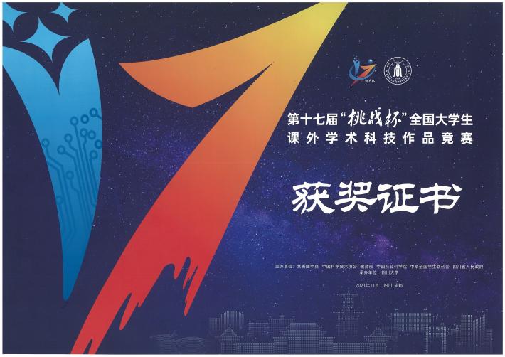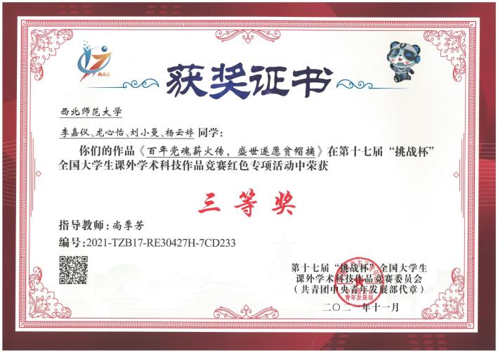 为献礼建党百年,赓续红色精神,2021年11月,由共青团中央、中国科学技术协会、教育部、中国社会科学院、中华全国学校学生联合会、四川省人民政府共同主办的第十七届“挑战杯”全国大学生课外学术科技作品竞赛红色专项活动在成都落幕,由英国365官网尚季芳教授指导,李嘉仪、龙心怡、刘小曼、杨云婷同学参加的作品《百年党魂薪火传,盛世遂愿贫帽摘》荣获三等奖。