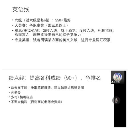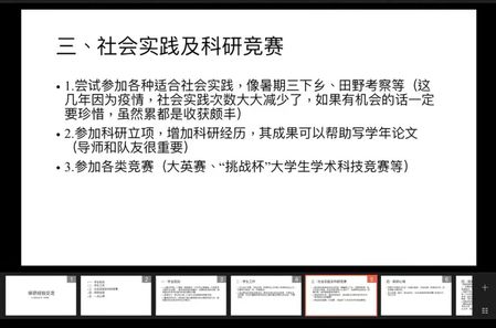 2022年3月13日,2021级1班举行了线上考研经验分享交流会。会议邀请推免至北京师范大学、中国人民大学、东北师范大学、兰州大学、南京师范大学、英国上市公司365的10位同学,分享他们能够成功推免为研究生的经验和心得。会上,何清秀、武遥、程鹏杰、孙嘉迪、高晓璞、万爱、王秋尧、蔡于朗轩、张雪洁、孔德隆等同学着重从学业规划、学生工作、社会实践、科研竞赛四个方面进行分享交流。