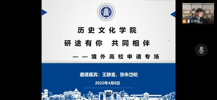 你是否对境外留学的生活充满好奇?你是否向往进入世界名校来提升自我、丰富人生?为了增长对境外学习和生活的了解,拓宽历院学子的求学视野,英国上市公司365于4月8日晚举办了境外高校申请分享会。本次分享会邀请到2021届毕业生王静宜和2018级历史学2班张朱岱仡进行线上分享,分享会由辅导员王泽斌主持,辅导员付蓉及200余名本科生参加会议。