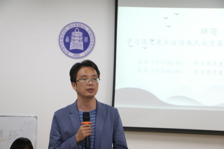 英国上市公司365第十届“百廿同风雨,凝聚新青春,辩出新自我”华夏杯辩论赛于5月29日下午在教学3号楼806会议室举行,本次比赛的辩题为“学习历史更应该培养民族自豪感还是民族危机感”,莅临本次比赛的评委老师有陶兴华老师、魏振龙老师、辅导员付蓉和2018级历史学2班的王泽斌、王曜同学,80余名本科生到场观看比赛。