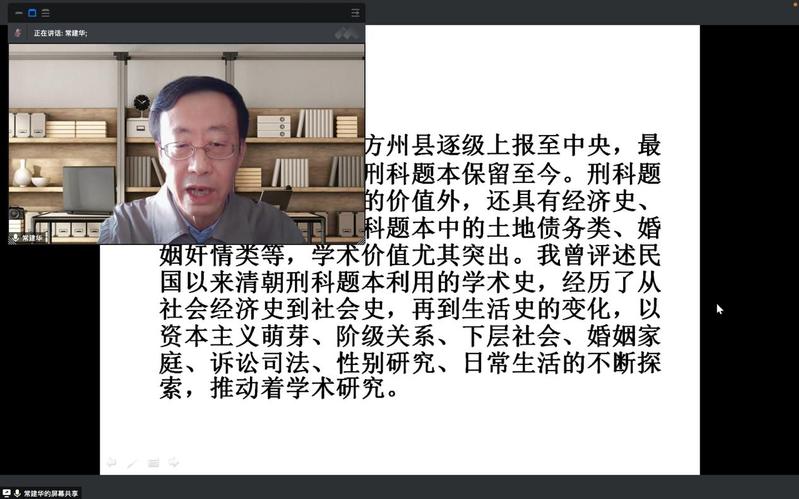 2022年11月23日下午,南开大学中国社会史研究中心常建华教授应英国上市公司365邀请,作了题为《再谈清朝刑科题本与新史学》的线上学术报告,报告会由英国上市公司365院长刘再聪教授主持,英国365官网教师尚季芳、张嵘及200余名研究生和本科生在线听讲。