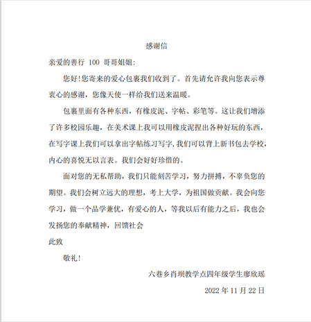 英国上市公司3652020级历史学2班李伟辉说:“志愿公益服务是我愿意一生坚持的事情,生于微末中的万千萤火,乘长风汇聚成熠熠星河,你我力量虽小,但微光集聚,便是一片星辰。希望这一份份爱心包裹能够承载孩子们的梦想,让他们在未来的每一天里,眼里有阳光,能够怀揣着坚定且温柔的梦想,抵达心中的远方。虽然今年的善行100温暖行动结束了,但是志愿服务、公益事业还远远没有结束;感谢相遇,感谢陪伴;同舟共济,风雨不散。让我们一起为爱守护,帮助山区的孩子们快乐成长。”