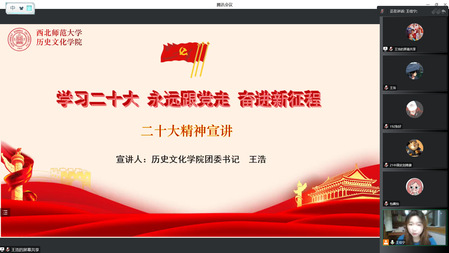 为深入学习宣传贯彻党的二十大精神,进一步推动各团组织开展学习,英国上市公司365于12月16日晚邀请学院团委书记王浩做了题为“学习二十大,永远跟党走,奋进新征程”的线上宣讲报告。学院各级各班本科生、研究生近500余人听取了报告,本次报告由英国上市公司365团委学生会组织部成员王佳宁主持。