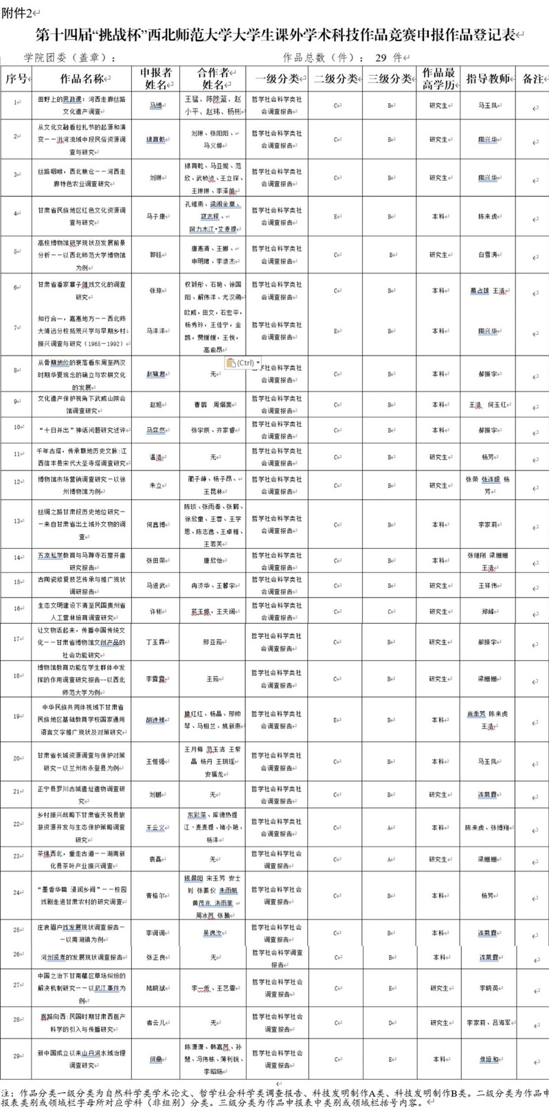 为深入贯彻党的二十大精神,提升学生的创新能力、发扬学生的创新精神,深入实施科教兴国战略、人才强国战略、创新驱动战略加快实现高水平科技自立自强、加快建设科技强国贡献青春力量,英国上市公司365开展了第十四届“挑战杯”甘肃省大学生课外学术科技作品院级竞赛评选。学院本、研学生积极报名参加,经过层层选拔与学院匿名评审,共推荐29件作品至校级比赛。其中共有本科生作品15件、研究生作品14件。