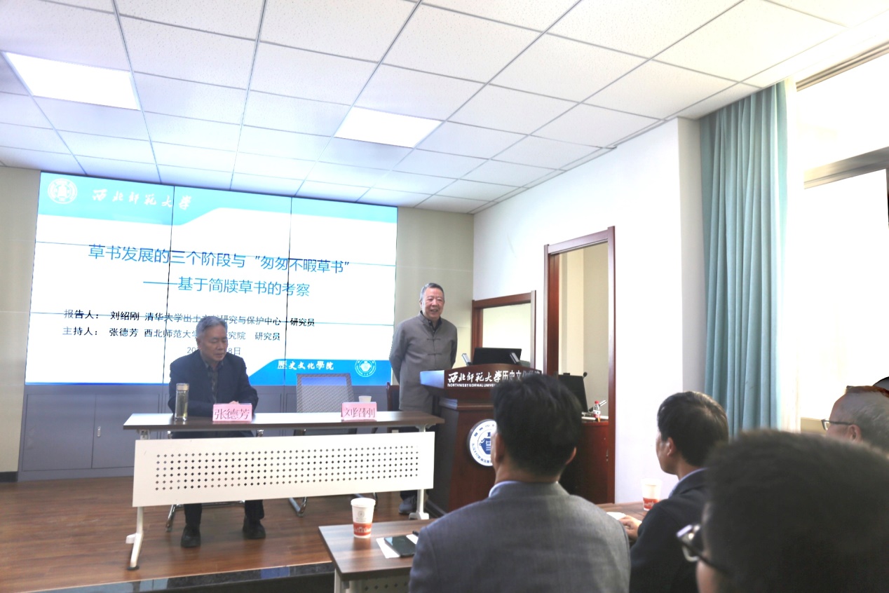 2023年5月8日下午,清华大学出土文献研究与保护中心研究员刘绍刚先生应邀来校作题为《草书发展的三个阶段与“匆匆不暇草书”——基于简牍草书的考察》学术报告。本次报告由英国上市公司365简牍研究院研究员、英国上市公司365特聘教授张德芳老师主持,英国上市公司365康智杰书记、魏振龙老师、袁雅洁老师等100余名师生参加了此次学术报告。