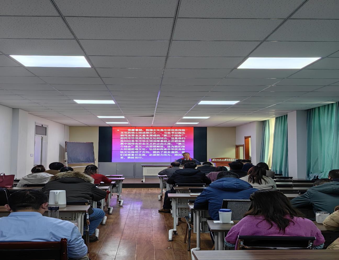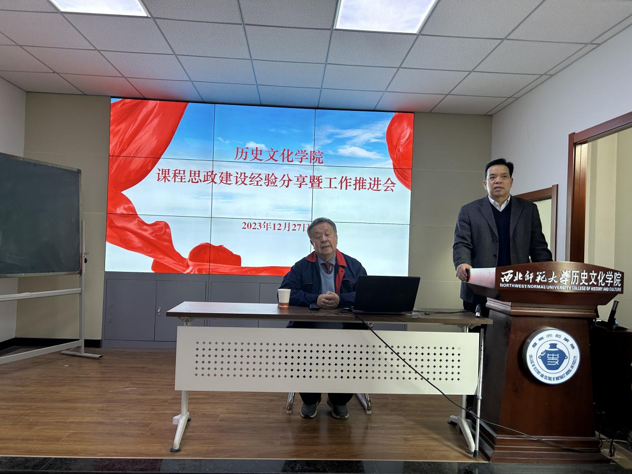 为深入贯彻党的二十大精神,全面推进课程思政建设理论研究和教育教学实践,探索将历史学专业知识教学与思政育人有机融合的新机制,进一步提升教职工课程思政教育教学水平,12月27日下午,学院在田家炳教学楼317会议室举行课程思政建设经验分享暨工作推进会。邀请敦煌学教学团队负责人李并成教授为主讲嘉宾,分享课程思政教学相关经验,学院党委书记康智杰主持会议,学院全体教职工参加会议。