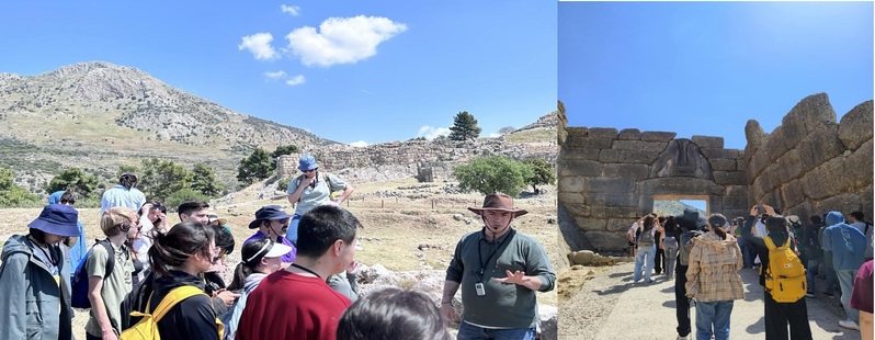 当天考察的最后一站,Vassilis Petrakis教授带领同学们前往了历史悠久的迈锡尼(Mycenae)考古遗址。该遗址包括建造防御工事的卫城和周围的陪葬和居住场所,大部分可见的遗址都可以追溯到公元前1350年至公元前1200年。老师为同学们一一介绍了遗址中现存的“狮子门”、墓葬圈A、迈锡尼王宫等,并带同学们参观了迈锡尼考古博物馆和距离遗址约五百米处的阿特柔斯宝库。在老师的讲解下,同学们不仅对迈锡尼时代的建筑艺术产生了极大的兴趣,还对迈锡尼文明在欧洲文明史上的重要地位有了更深入的认识。