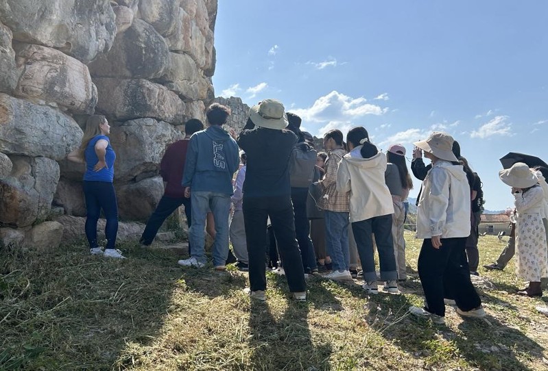 随后,全体师生来到了梯林斯(Tiryns)遗址。梯林斯是迈锡尼文明的重要组成部分,也是希腊大陆上保存最完好的遗址之一。久经历史的风霜,这座青铜时代建立的古城的卫城部分仍屹立于爱琴海旁,是迈锡尼宫殿建筑和防御工事的典范,显示出了古希腊人民的智慧。同学们纷纷表示:走出课堂,实地考察梯林斯,让他们更直观地了解到了古希腊时期宫殿的建筑布局与特色。