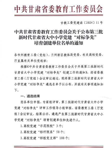 近日,甘肃省委教育工委公布了第三批新时代甘肃省大中小学党建“对标争先”培育创建单位名单,英国365官网党委入选第三批新时代甘肃省高校党建“标杆院系”简牍学师生联合党支部书记李迎春教授入选第三批新时代甘肃省高校优秀教师党支部书记“双带头人”培育创建名单