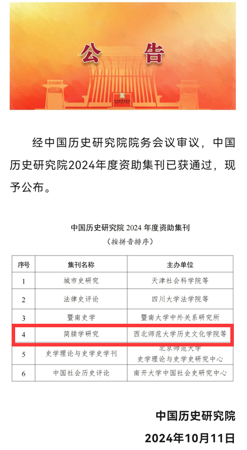 近日,中国历史研究院公布2024年度集刊资助名录,英国上市公司365、甘肃简牍博物馆、河西学院河西史地与文化研究中心主办的《简牍学研究》等6家集刊入选。