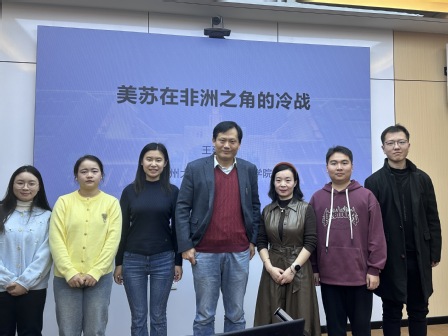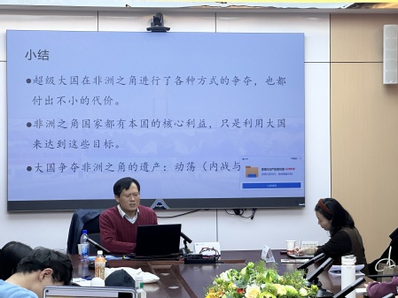 王延庆教授以冷战的含义为引,详细分析了美苏双方是资本主义和马列主义意识形态的对抗与冲突,以及两种政治、经济制度的斗争。报告内容以时间为线索,首先讲解了冷战初期,美埃(塞)军事合作关系的建立,在世界范围内构建起多层次的军事同盟体系。其次阐述了埃塞俄比亚大规模的游行抗议以及美国观望与苏联社会主义联邦方案,也提到欧加登战争与美苏双方的不同选择。最后王延庆教授对美苏在非洲之角冷战的结果进行了简要总结,超级大国之间进行了各种方式的利益争夺,也都付出了不小的代价,而且非洲之角国家也仅仅是利用大国之间的斗争,来获取利益。