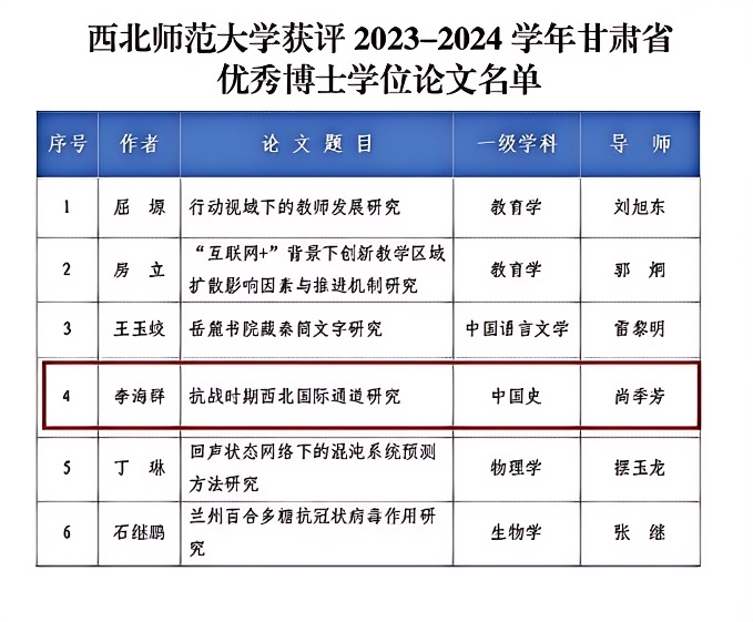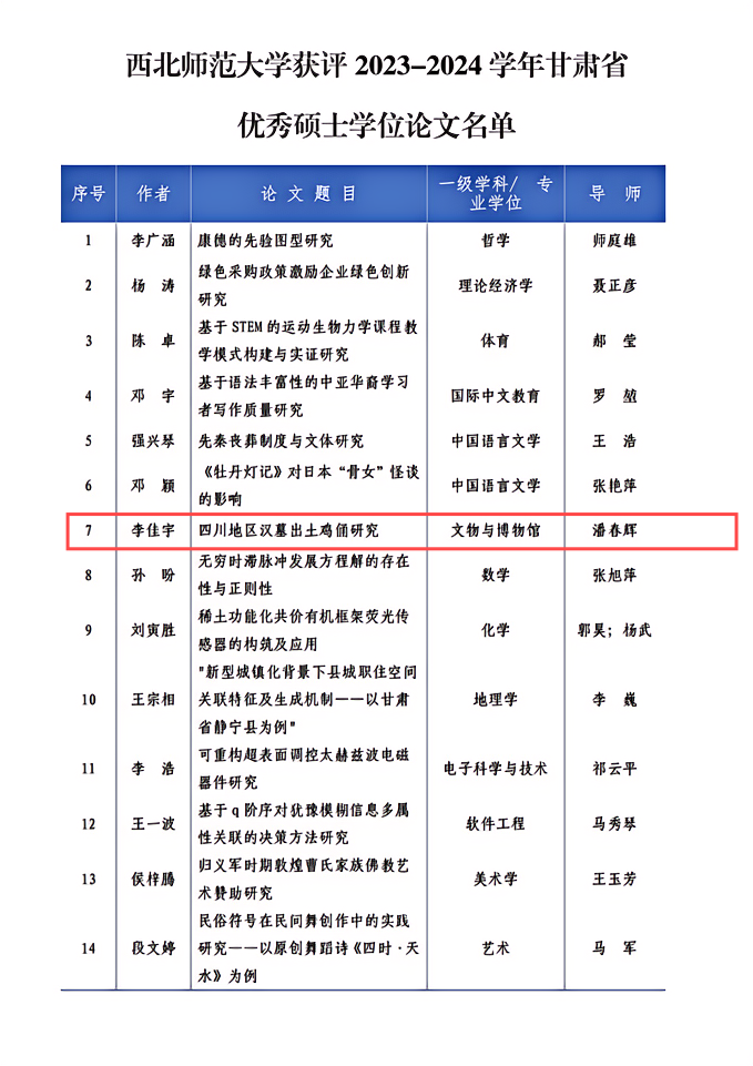 其中中国史专业李海群同学的《抗战时期西北国际通道研究》被评为省级优秀博士学位论文(导师:尚季芳),文物与博物馆专业李佳宇同学的《四川地区汉墓出土鸡俑研究》被评为省级优秀硕士学位论文(导师:潘春辉)。