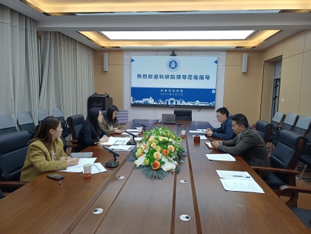 张继刚院长首先对杨鑫、童丹丹副院长一行的到来表示热烈欢迎和衷心感谢,并简要介绍了学院近年在科研领域取得的主要成果及未来发展的方向。院长表示,学院始终坚持以科研为驱动,充分调动教师作科研的积极性和主动性,在论文发表、项目申报、著作出版方面多用力,努力提升科研水平和影响力。郝振宇副院长从项目申报的基本情况、论证情况、激励政策、培育计划和问题困难几个方面作了汇报。