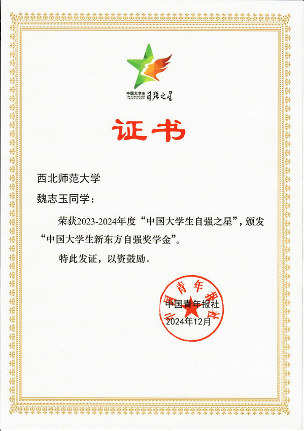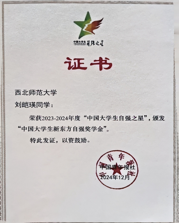 近日,由共青团中央、全国学联指导,团中央基层建设部、中国青年报社主办的2023—2024年度“中国大学生自强之星”奖学金推报活动评选结果揭晓。西北师大共有4名学子入选,其中,历史文化学院2022级硕士研究生魏志玉、2022级历史学2班本科生刘皑瑛两位同学荣获2023—2024年度“中国大学生自强之星”,获颁“中国大学生新东方自强奖学金”。