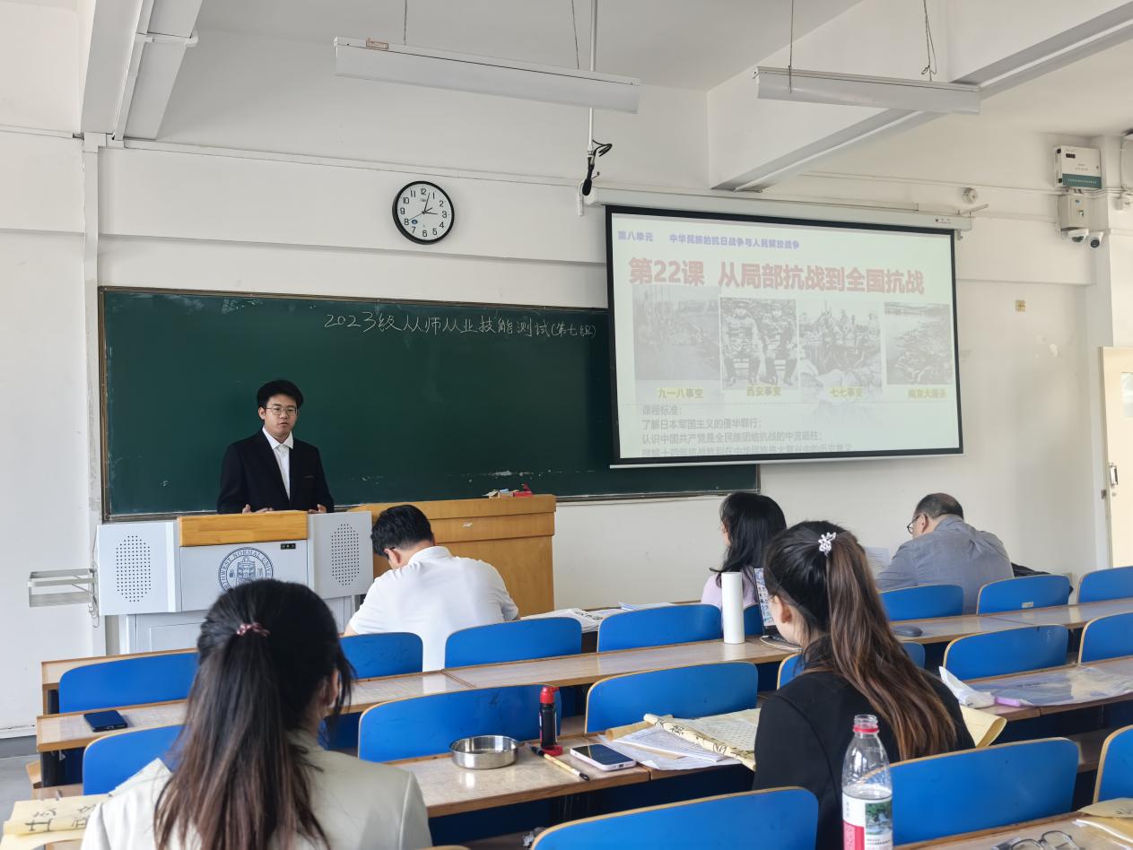 本次测试从三笔字、教学设计、课件制作、模拟上课、板书、即席讲演六个方面来展开,旨在考察师范生的教学基本功与学科素养。作为教师职业的基本技能,三笔字书写能力是师范生培养的重要环节,测试中学生需在规定时间内现场书写,评委从规范性、艺术性、教学实用性三个维度来进行评分。教学设计和课件制作环节要求学生围绕高中历史教材某一单元某一节,撰写完整的教学方案。评委老师重点关注教学设计完整性和课件制作是否精良。模拟上课是测试的核心环节,学生需在10分钟内完成一节微型课,并接受评委提问。学院为此同时组织了2024级的同学在测试教室观摩,以求最大化模拟真实课堂听课效果。即席演讲是思维和表达的双重考验,学生们随机选取要演讲的主题,评委老师则从主题契合度、表达技巧、仪态与时间三方面给予评价。